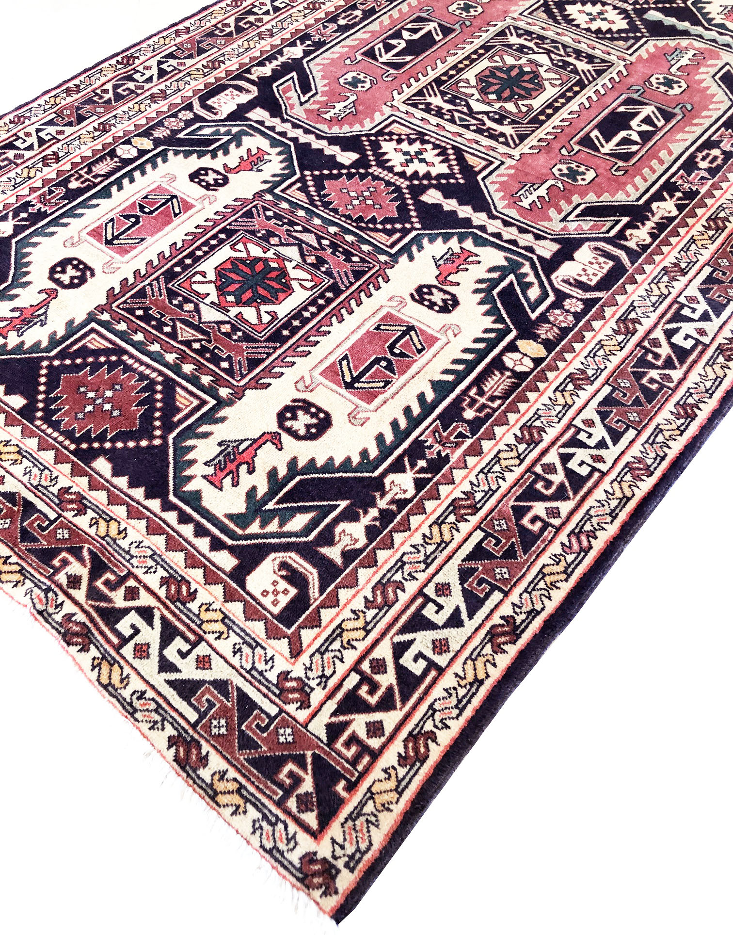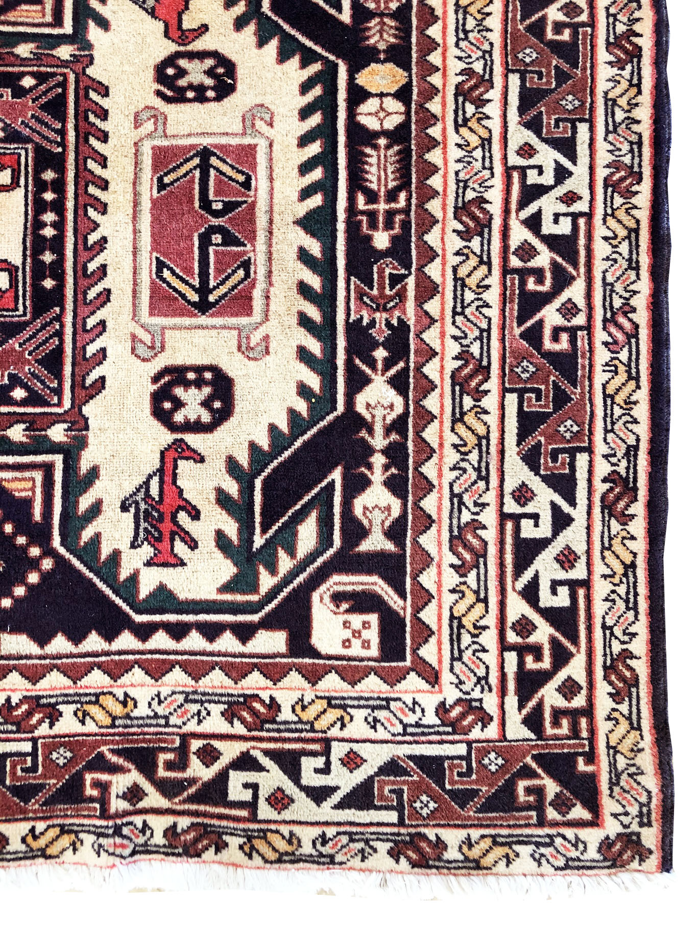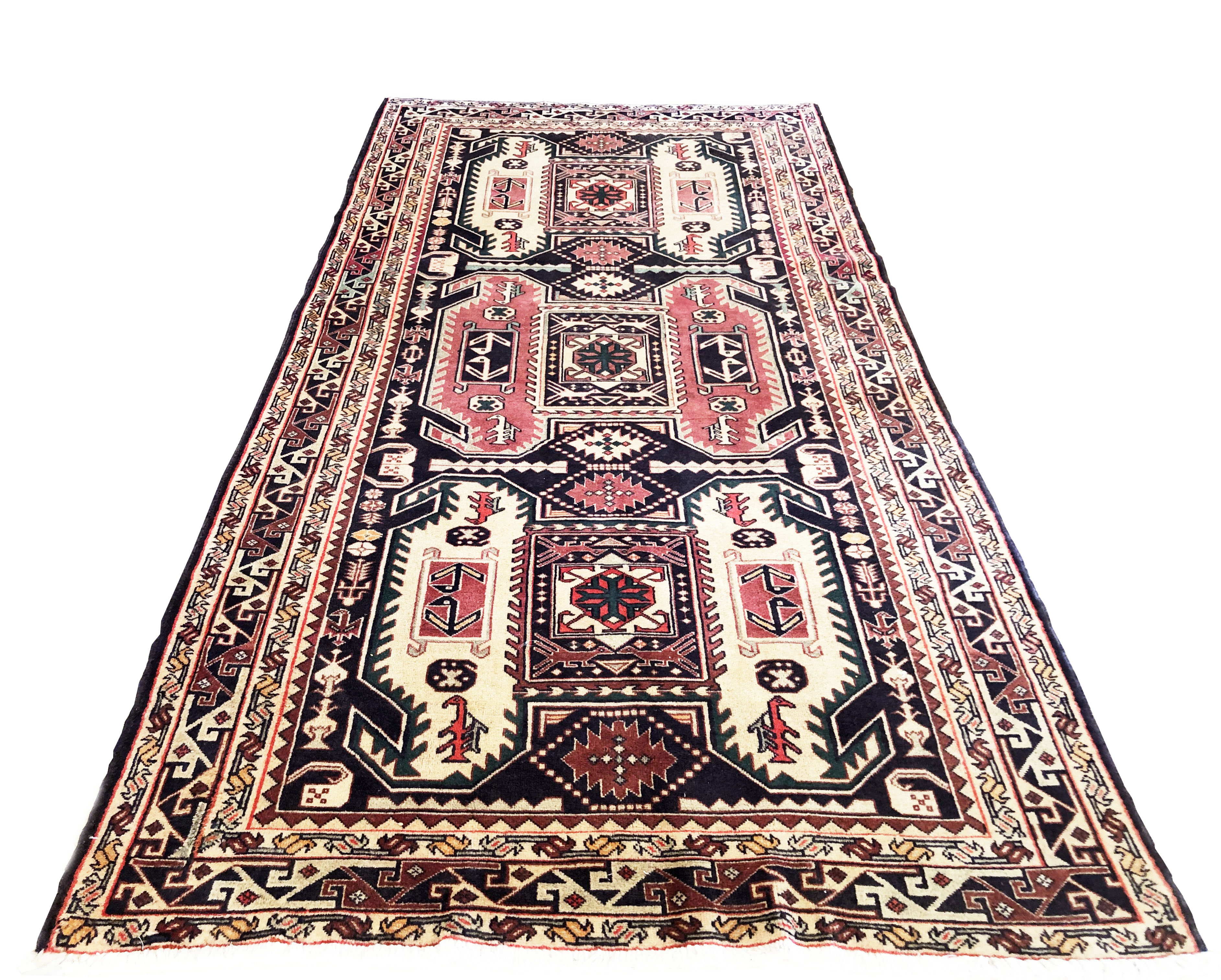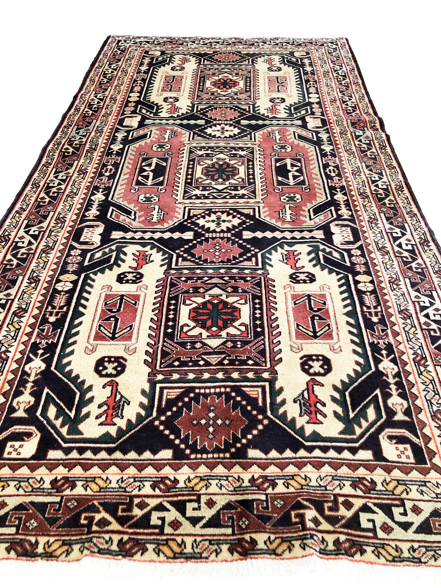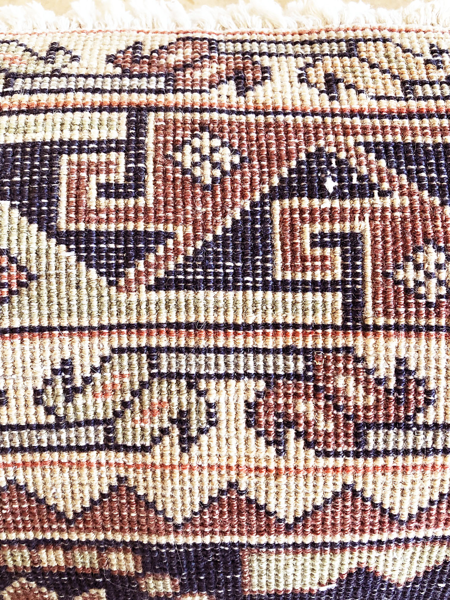 Size: 5x9.10x12.11/ Pile: Wool / Foundation: Cotton / Design: Geometric-Repeated Medallion / Base Color: Dark Blue / Border Color: Dark Blue / Age: 1960’s