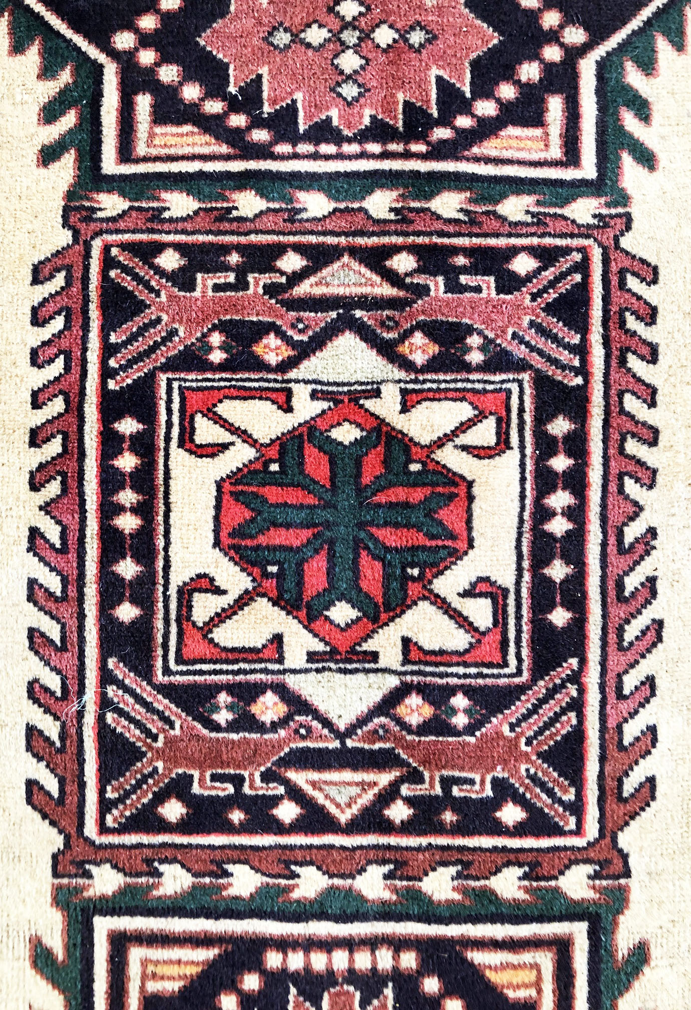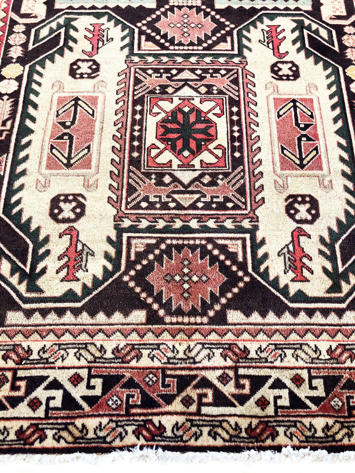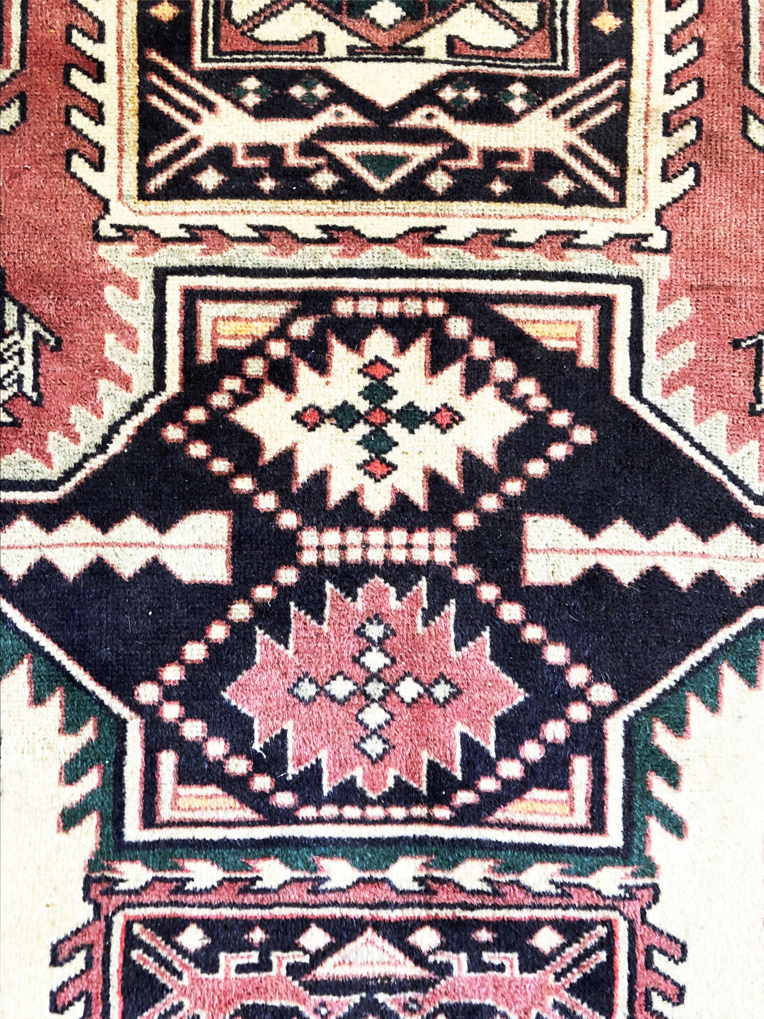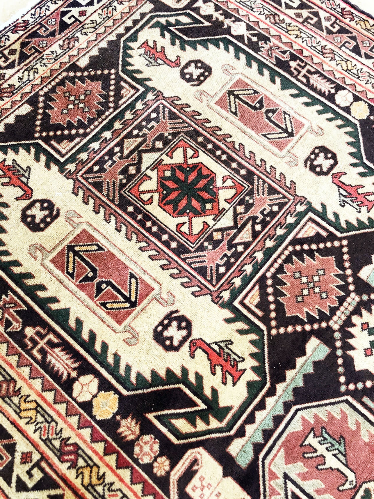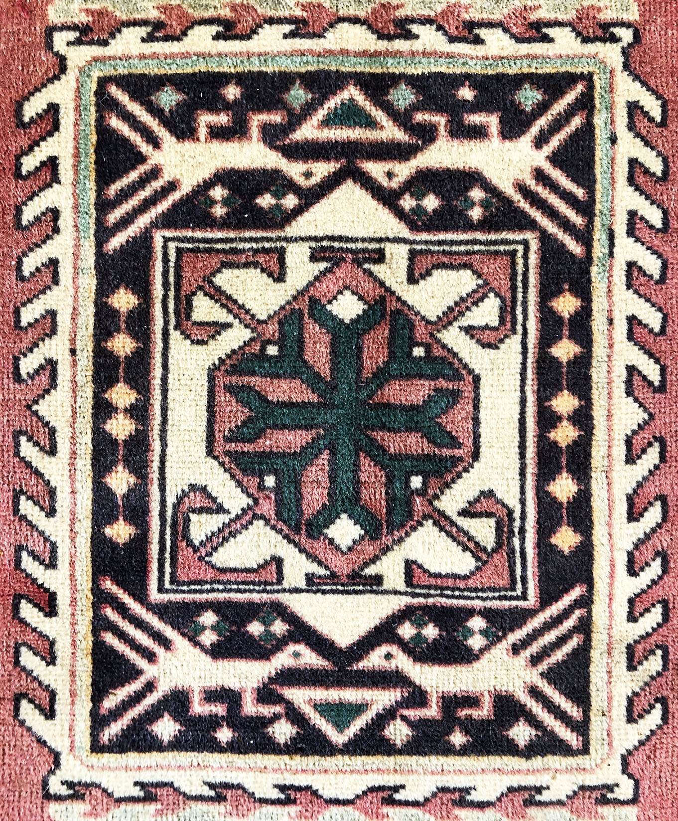 Size: 5x9.10x12.11/ Pile: Wool / Foundation: Cotton / Design: Geometric-Repeated Medallion / Base Color: Dark Blue / Border Color: Dark Blue / Age: 1960’s