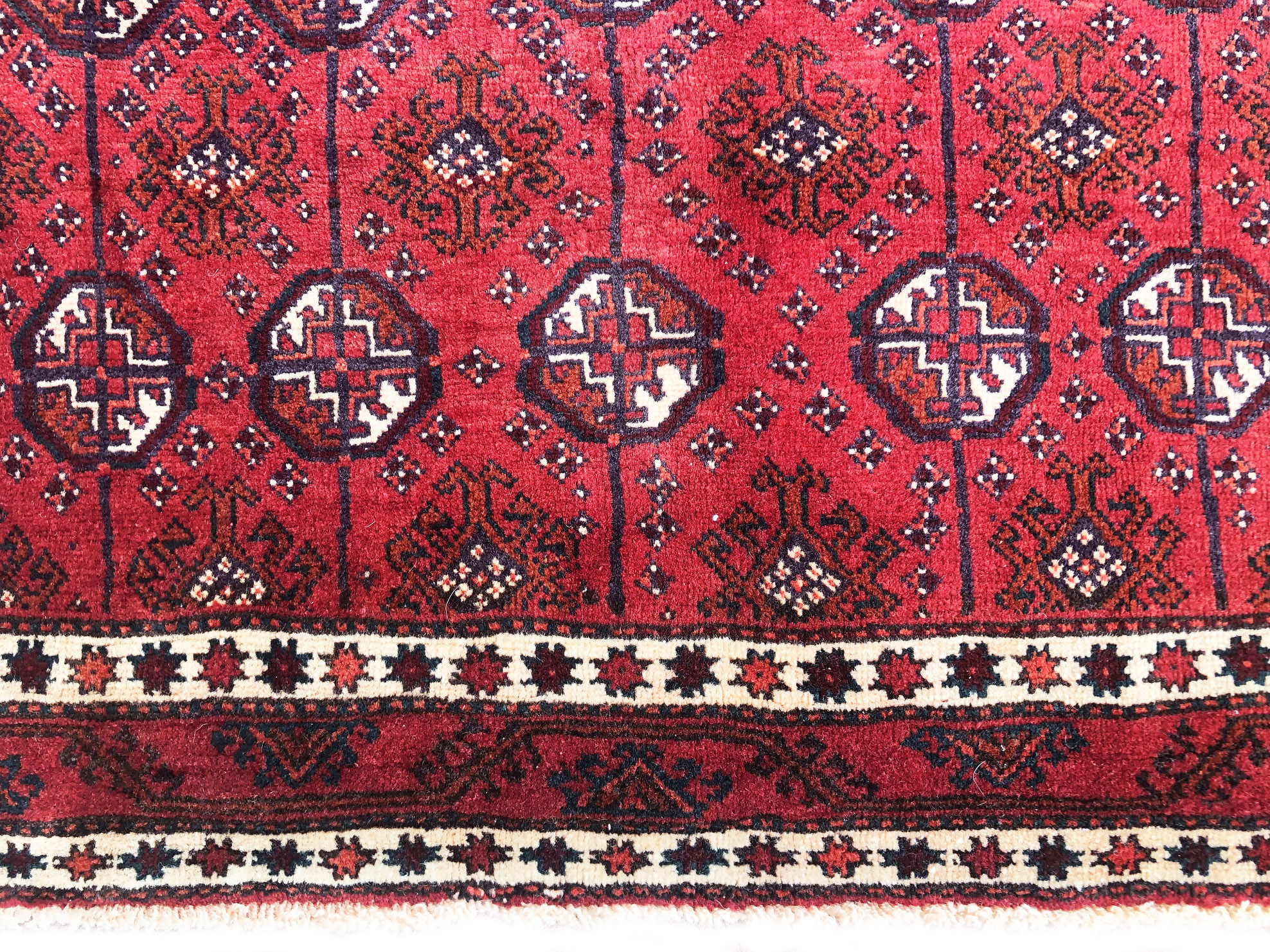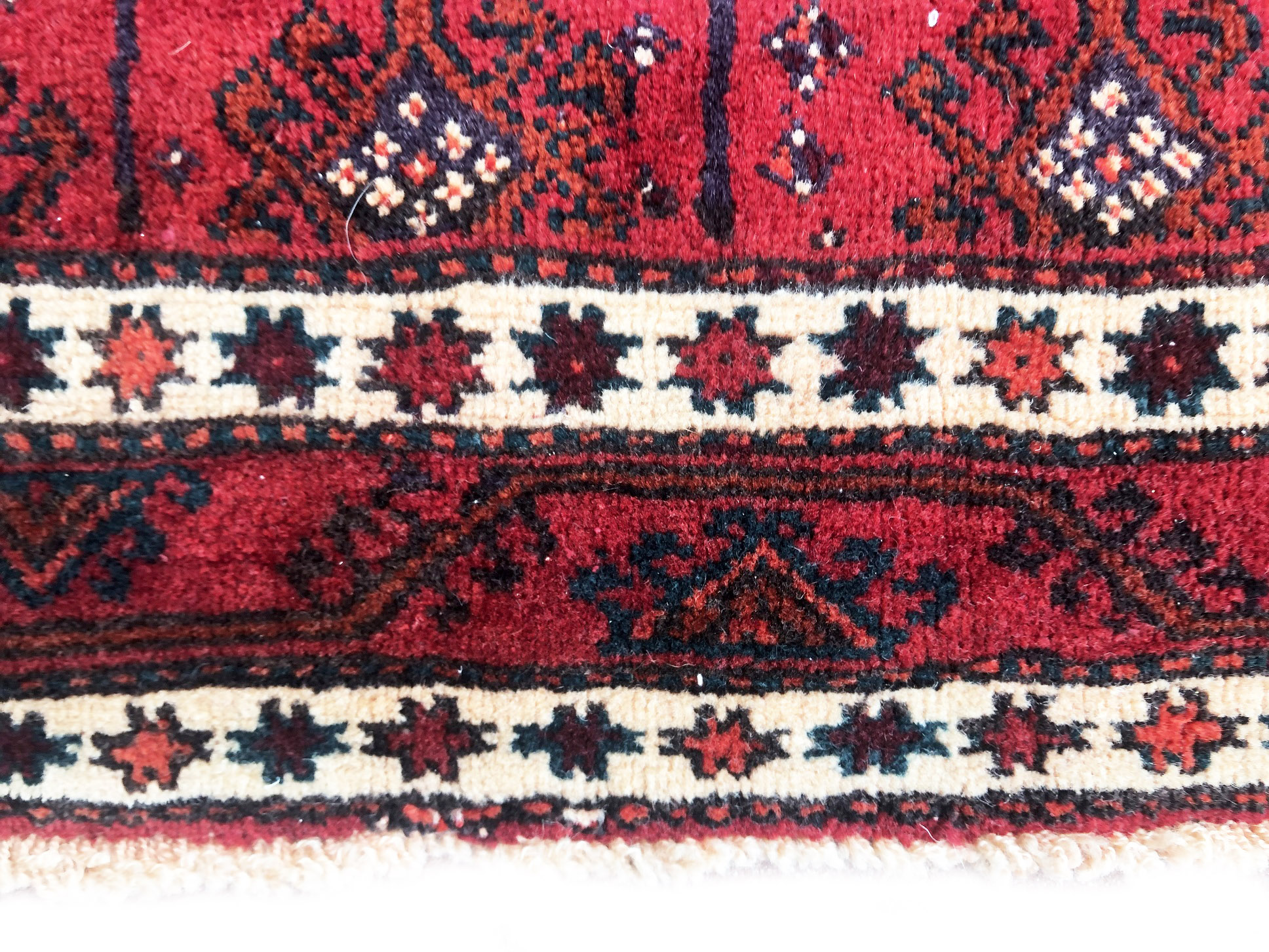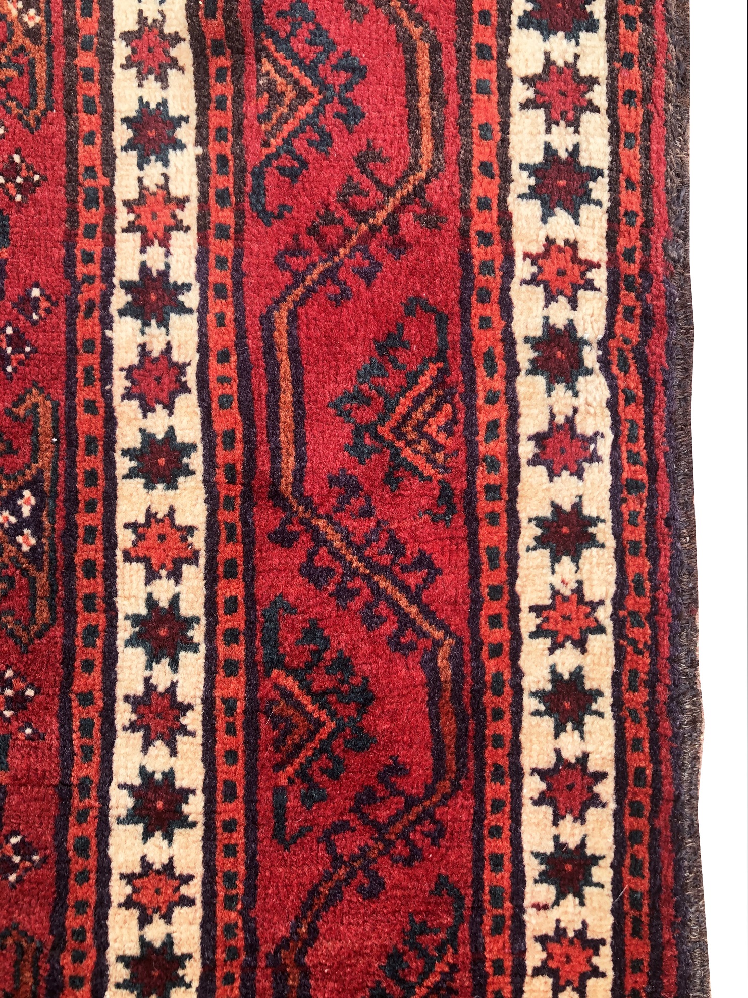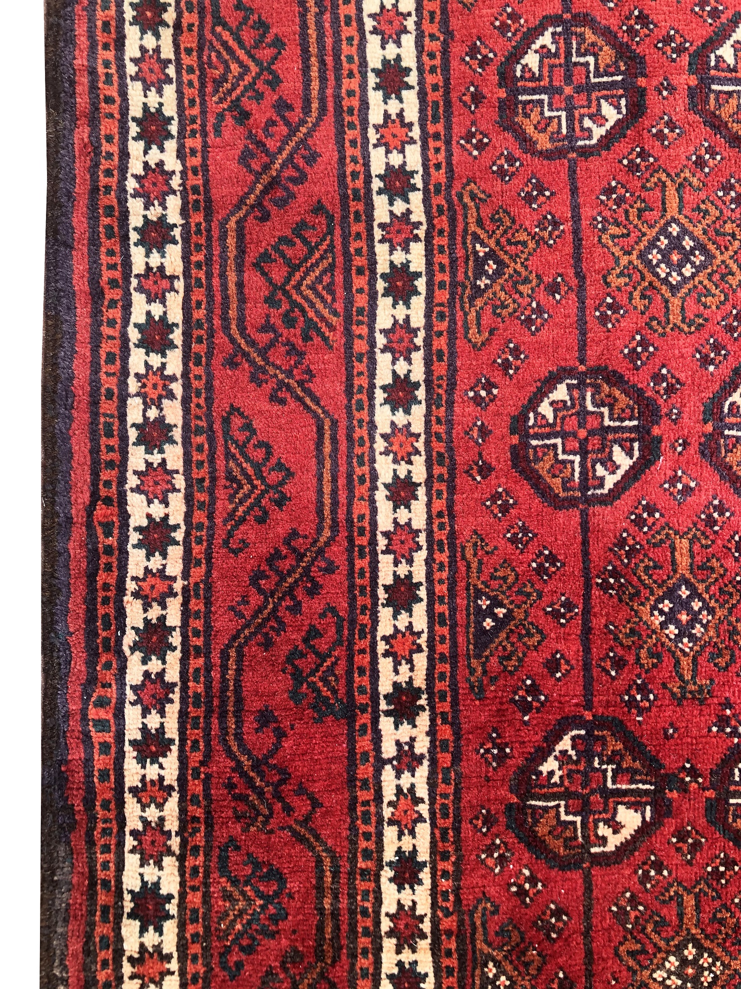 Size: 4.4x9-9 / Pile: Wool / Foundation: Wool / Design: Geometric-Elephant Print / Base Color: Red/ Border Color: Red / Age: 1960’S
