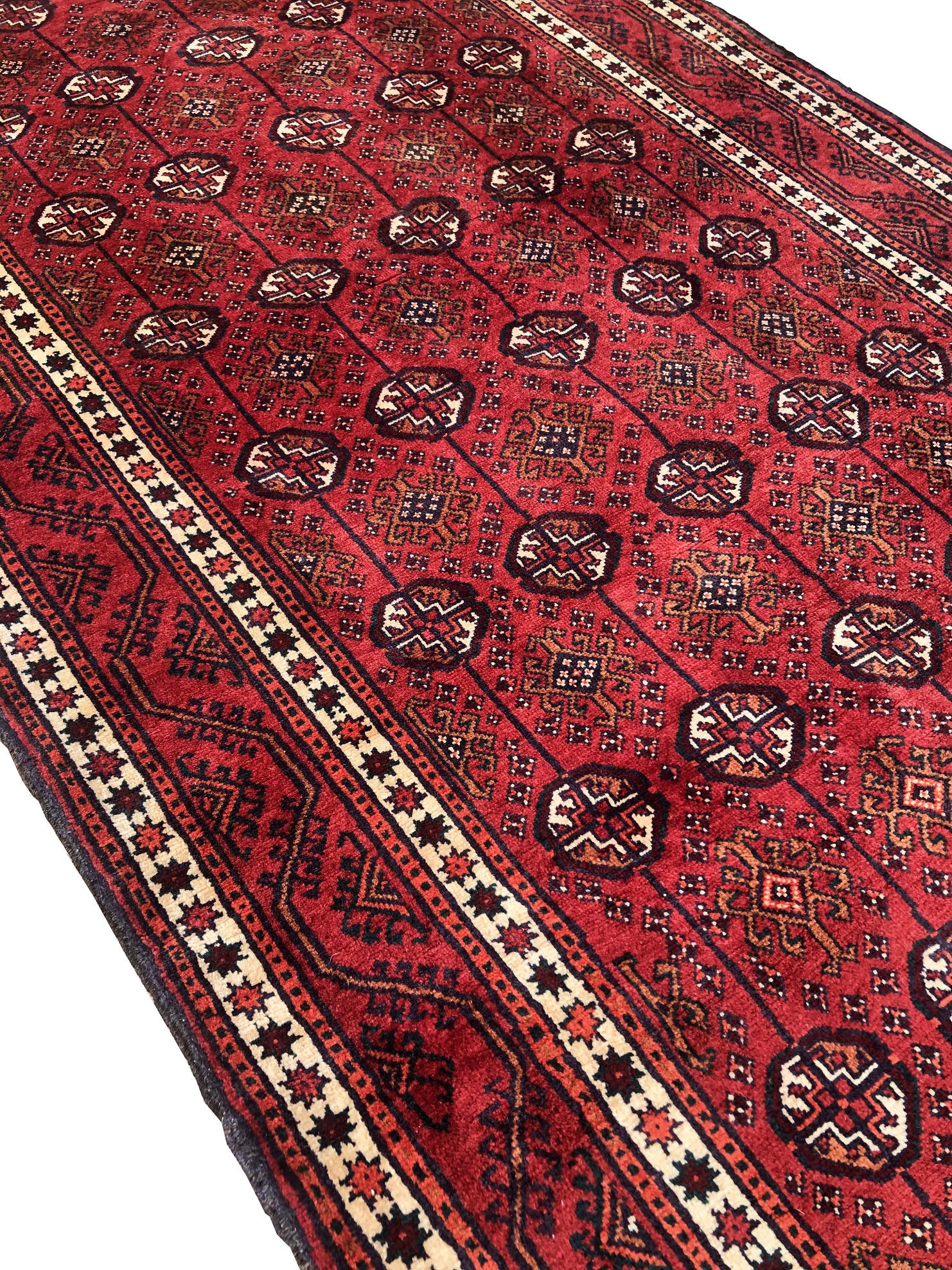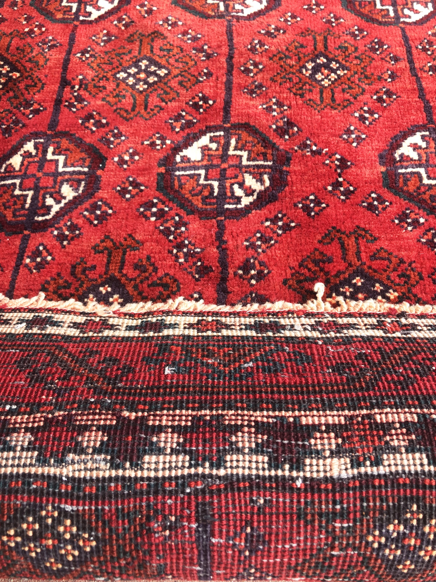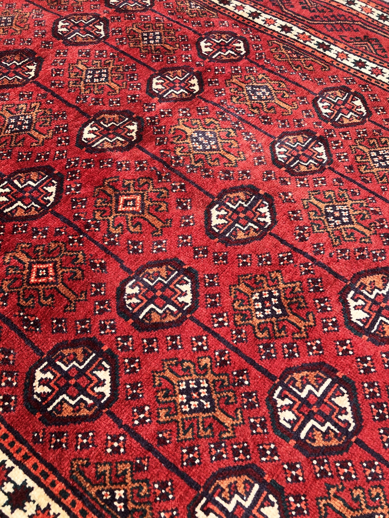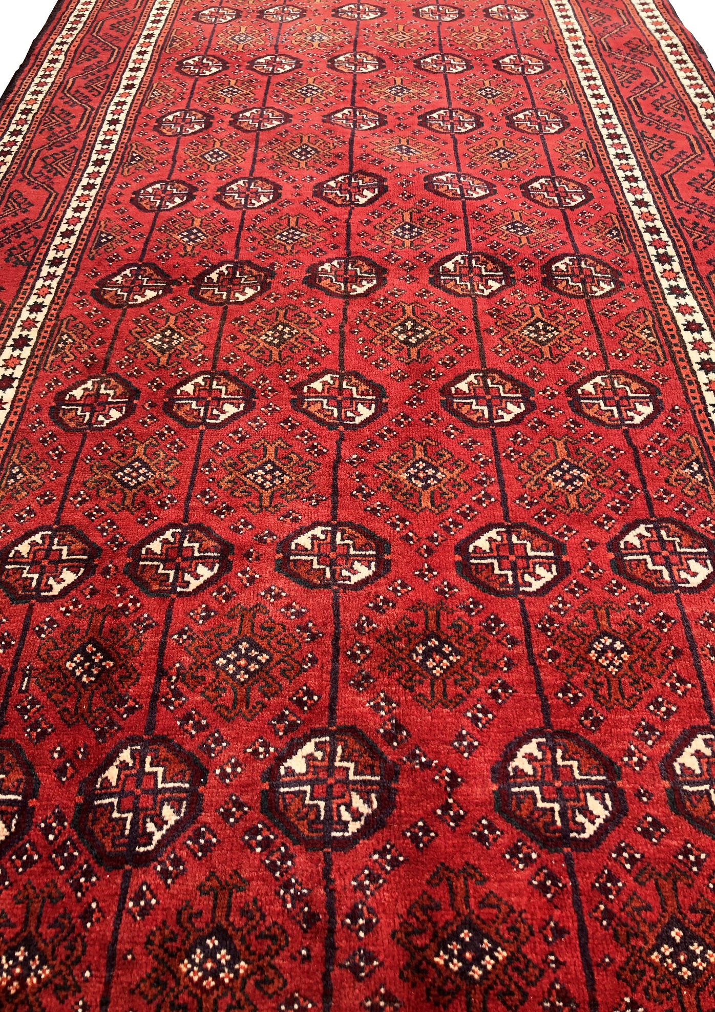 Size: 4.4x9-9 / Pile: Wool / Foundation: Wool / Design: Geometric-Elephant Print / Base Color: Red/ Border Color: Red / Age: 1960’S