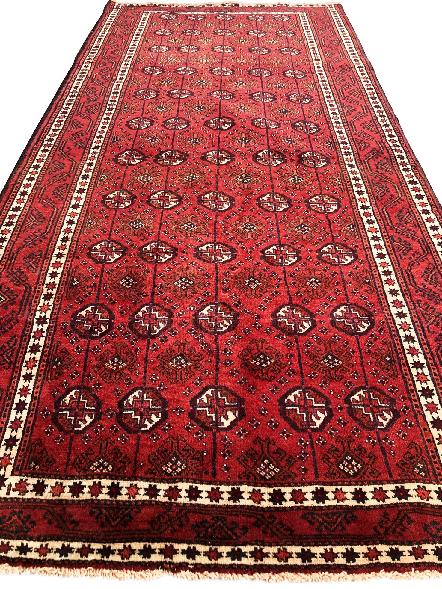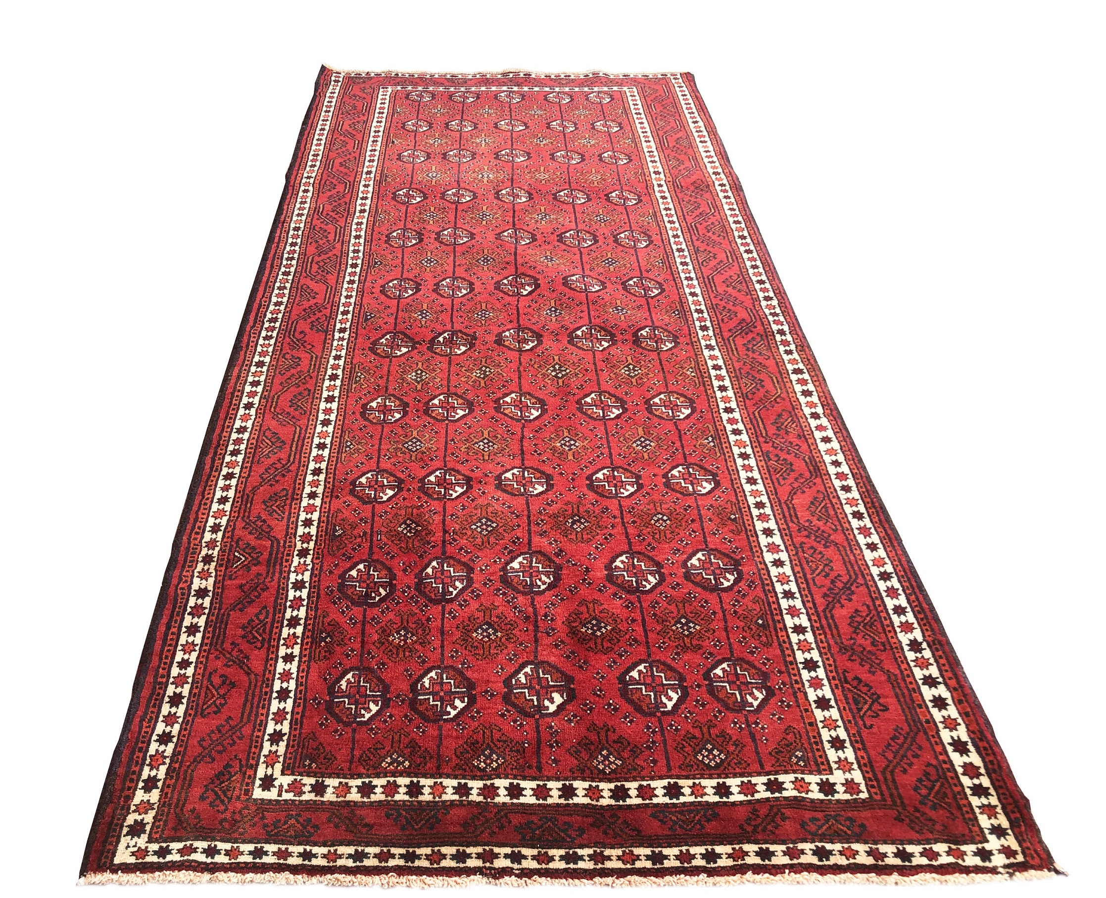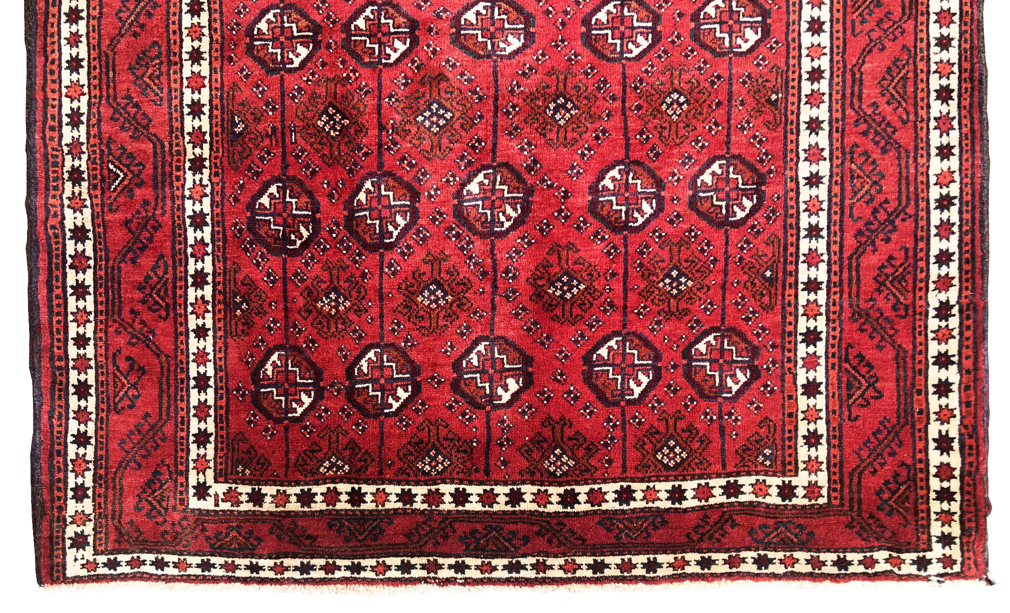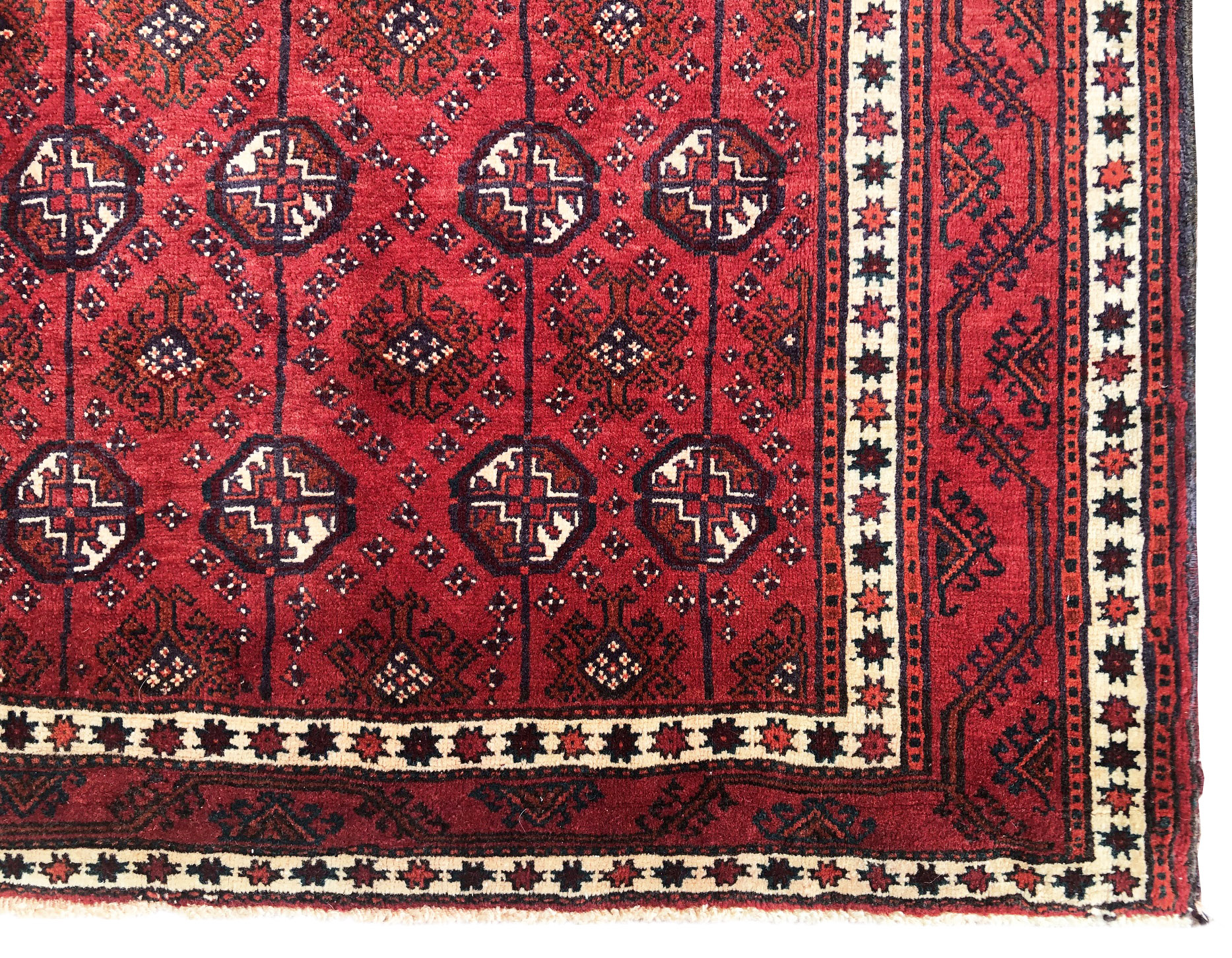 Size: 4.4x9-9 / Pile: Wool / Foundation: Wool / Design: Geometric-Elephant Print / Base Color: Red/ Border Color: Red / Age: 1960’S