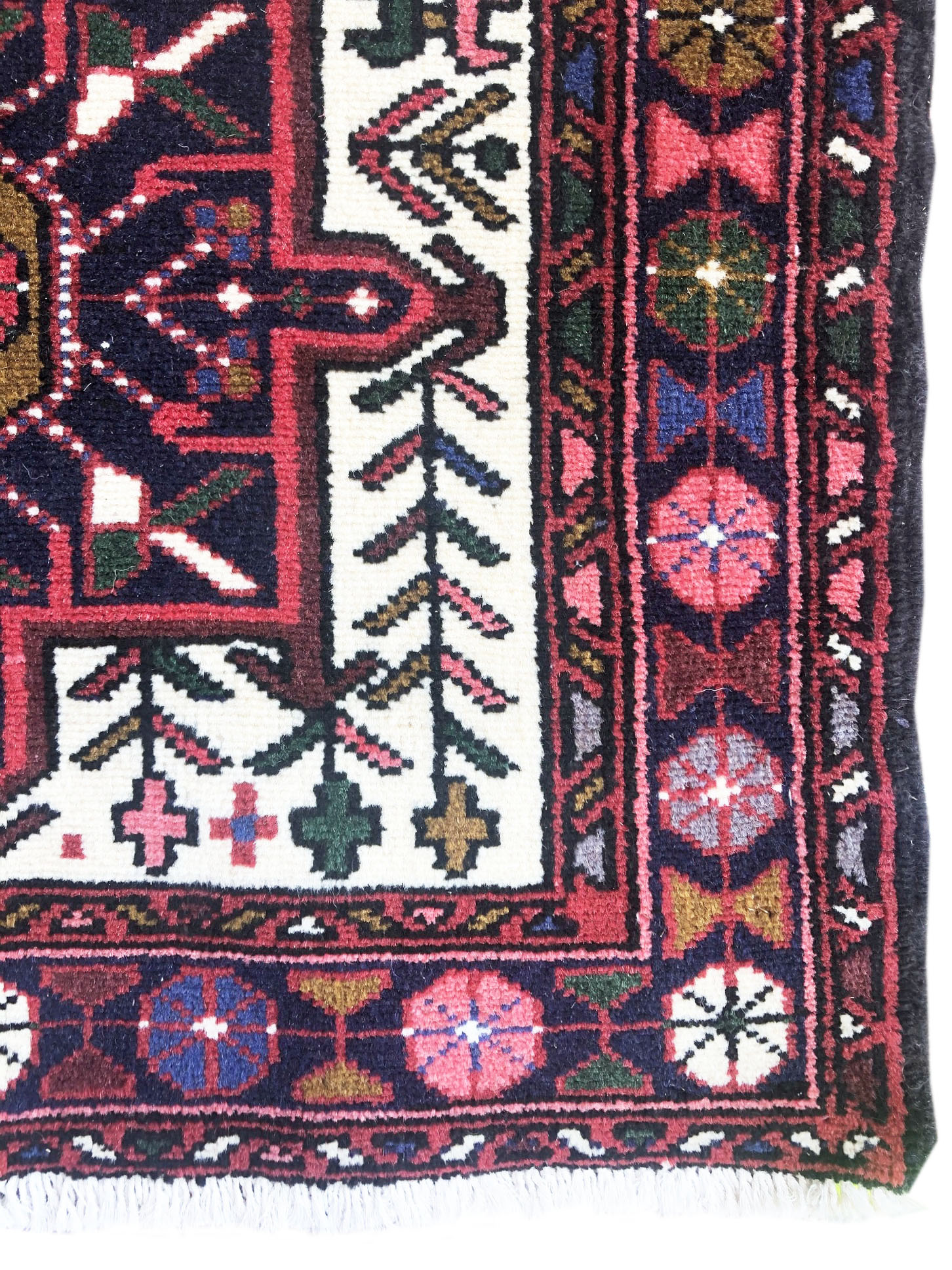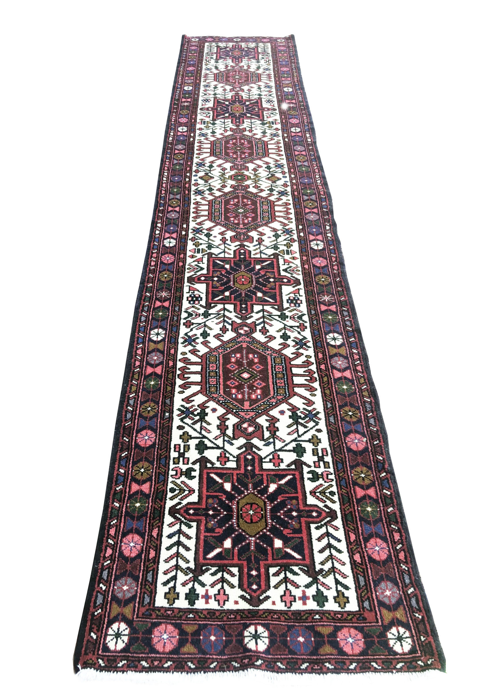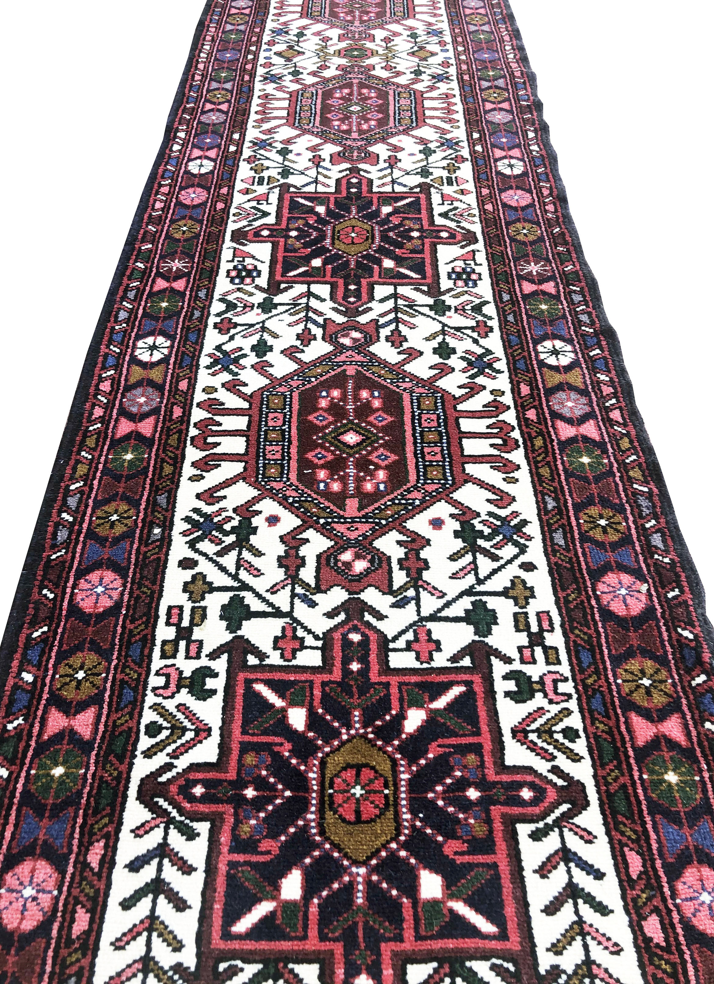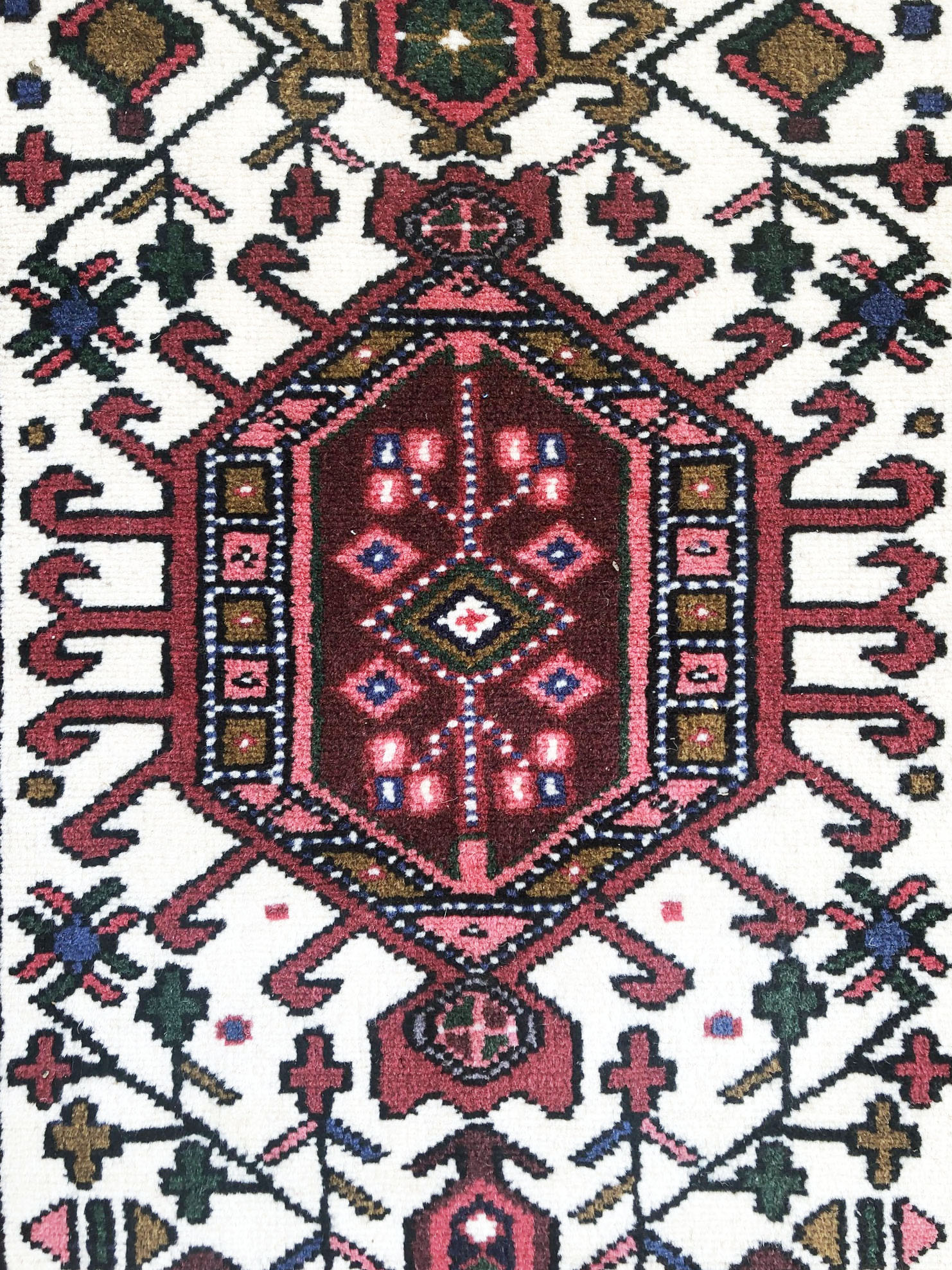 Size: 2.9X12.10 / Pile: Wool / Foundation: Cotton / Design: Geometric – Repeated Medallion / Base Color: Cream / Border Color: Dark Blue / Age: 1960’s