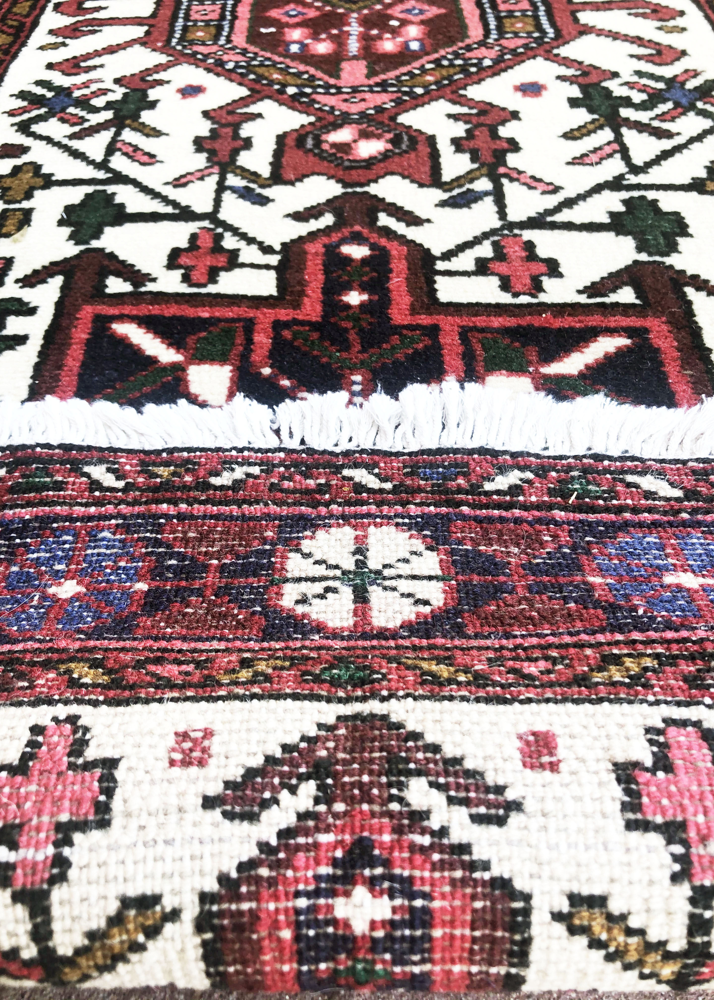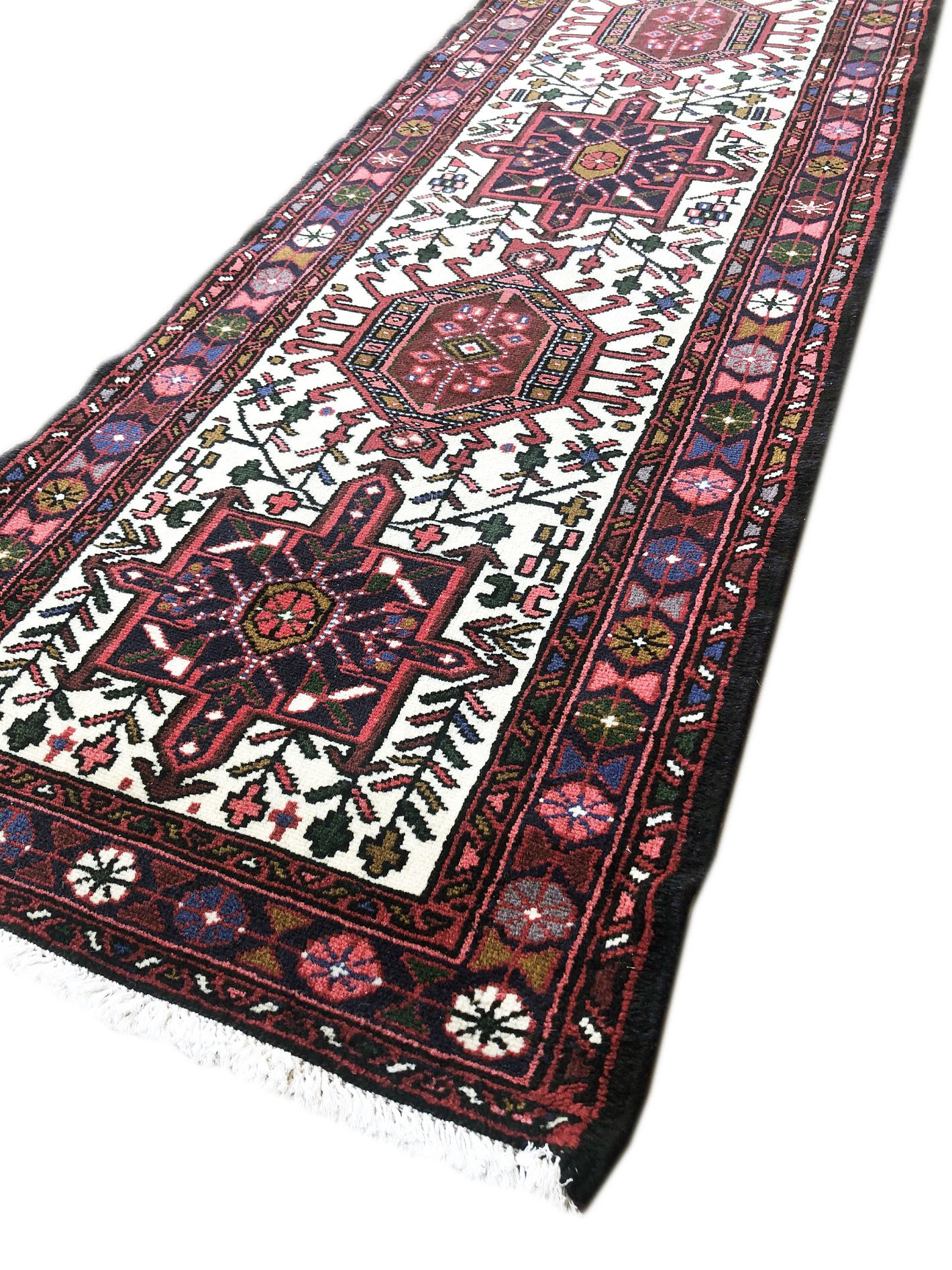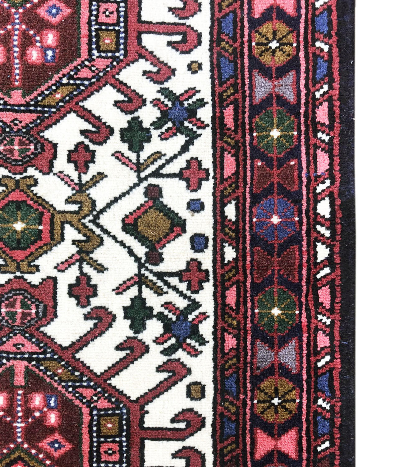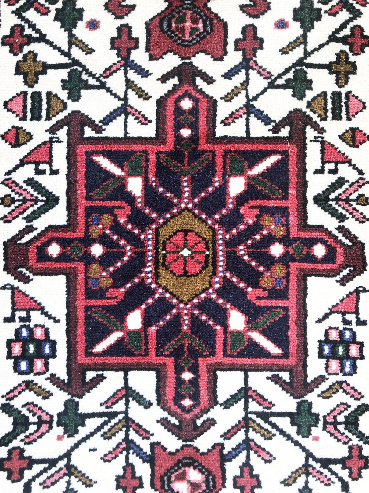 Size: 2.9X12.10 / Pile: Wool / Foundation: Cotton / Design: Geometric – Repeated Medallion / Base Color: Cream / Border Color: Dark Blue / Age: 1960’s