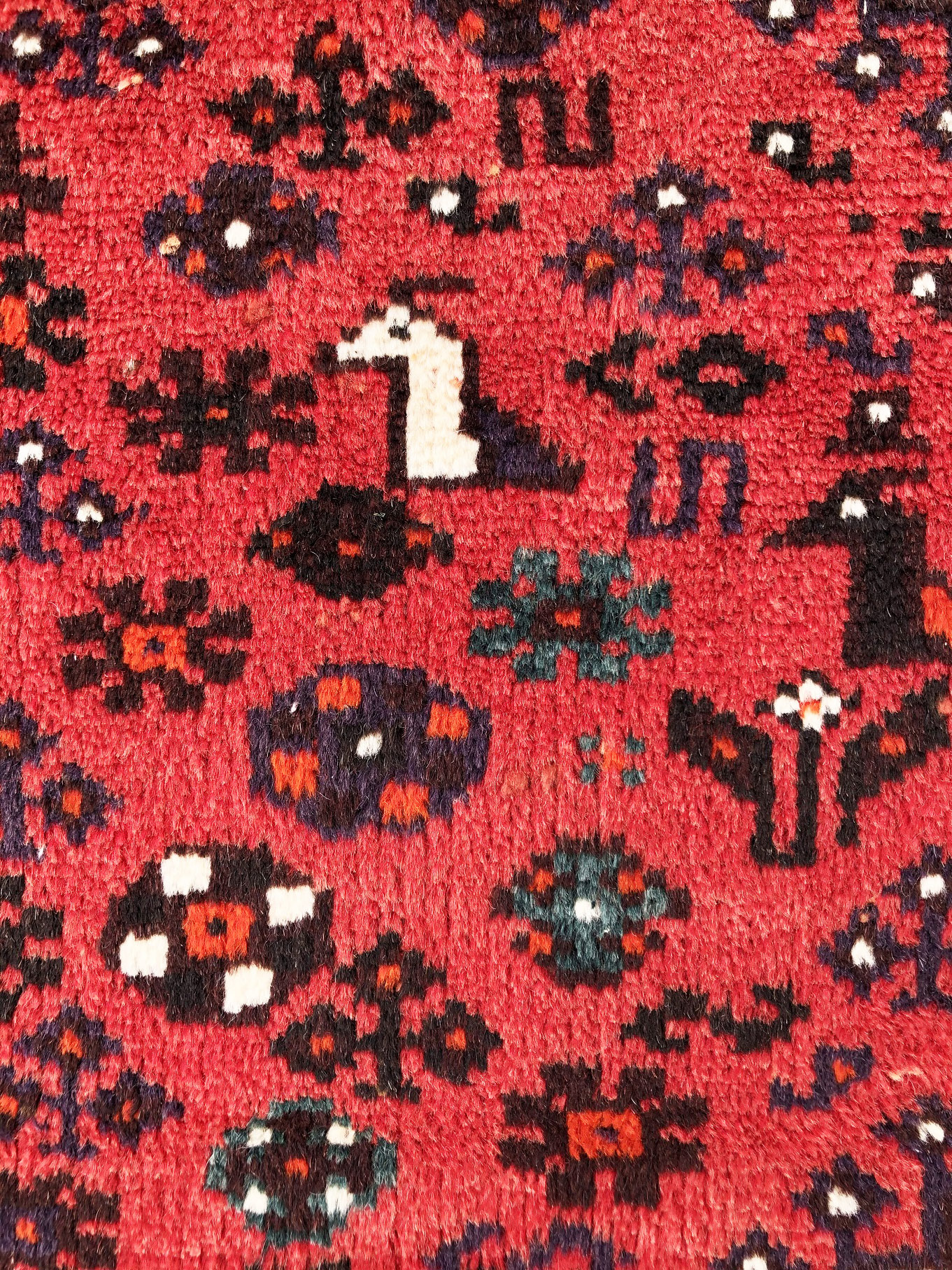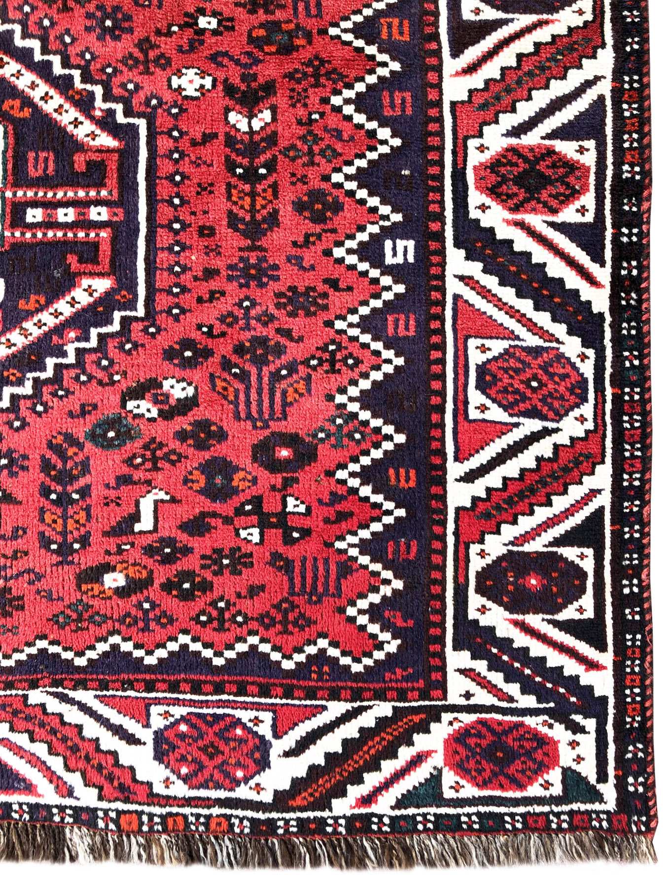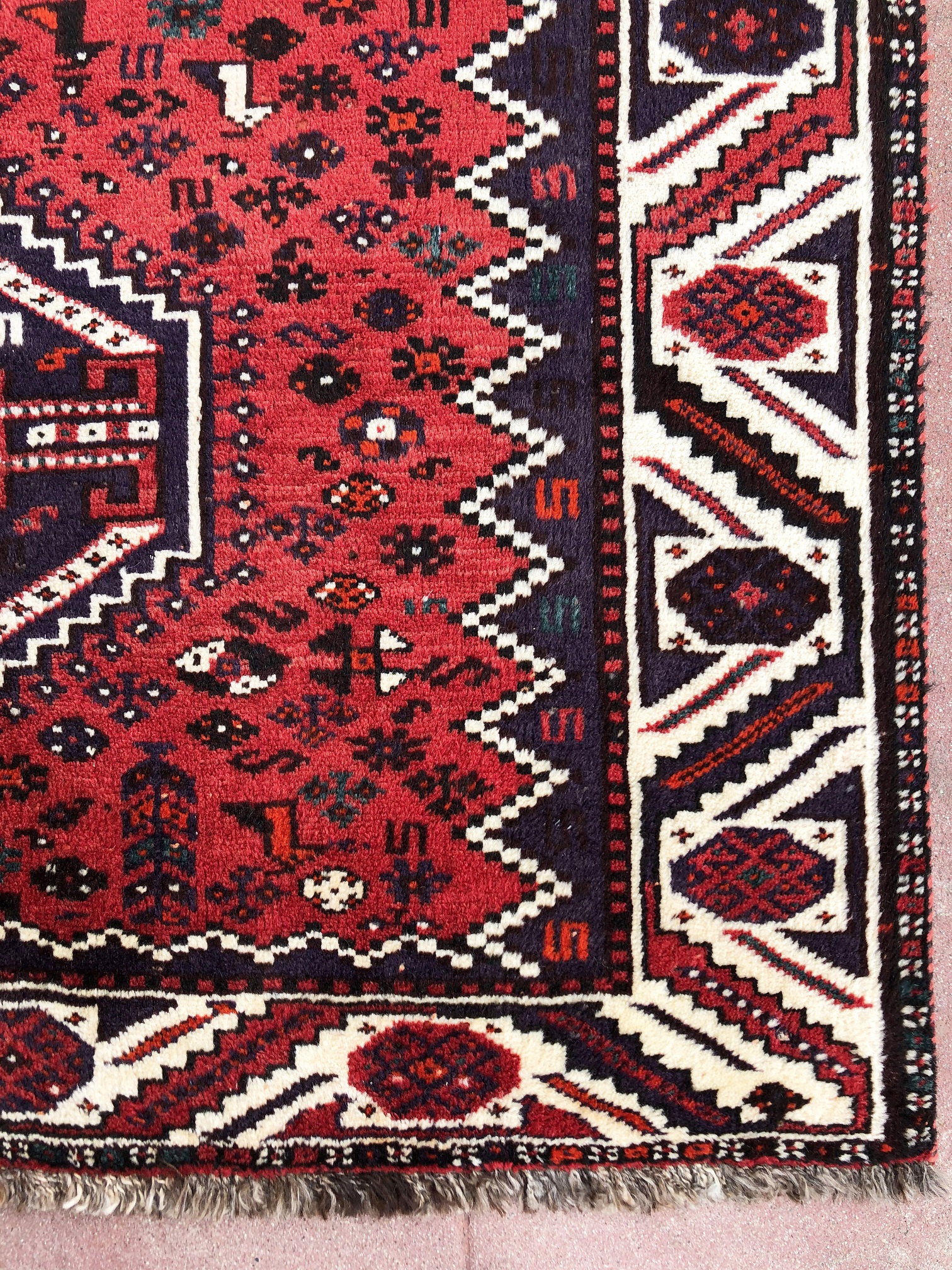 Size: 4.11x8 / Pile: Wool / Foundation: Wool / Design: Geometric-Repeated Medallion / Base Color: Red/ Border Color: Cream / Age: 1960’S