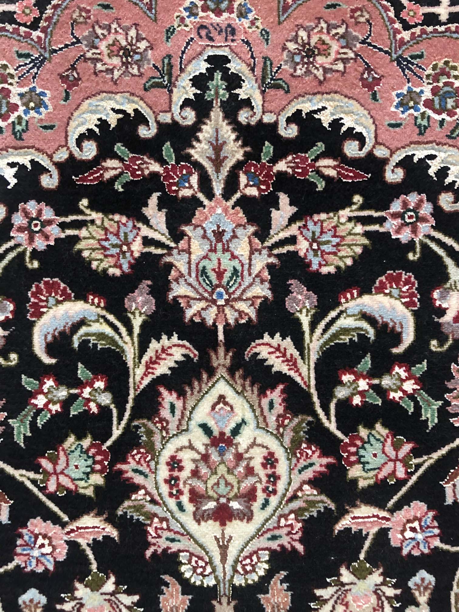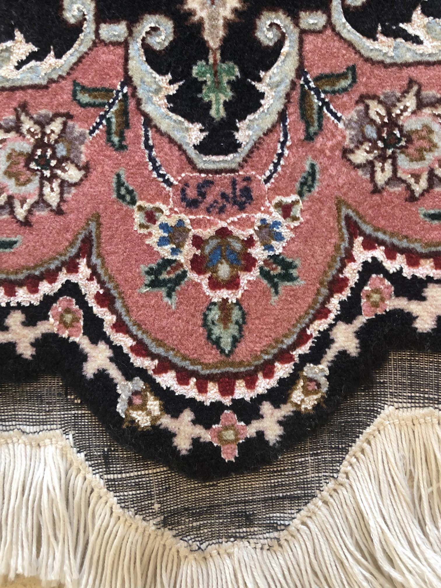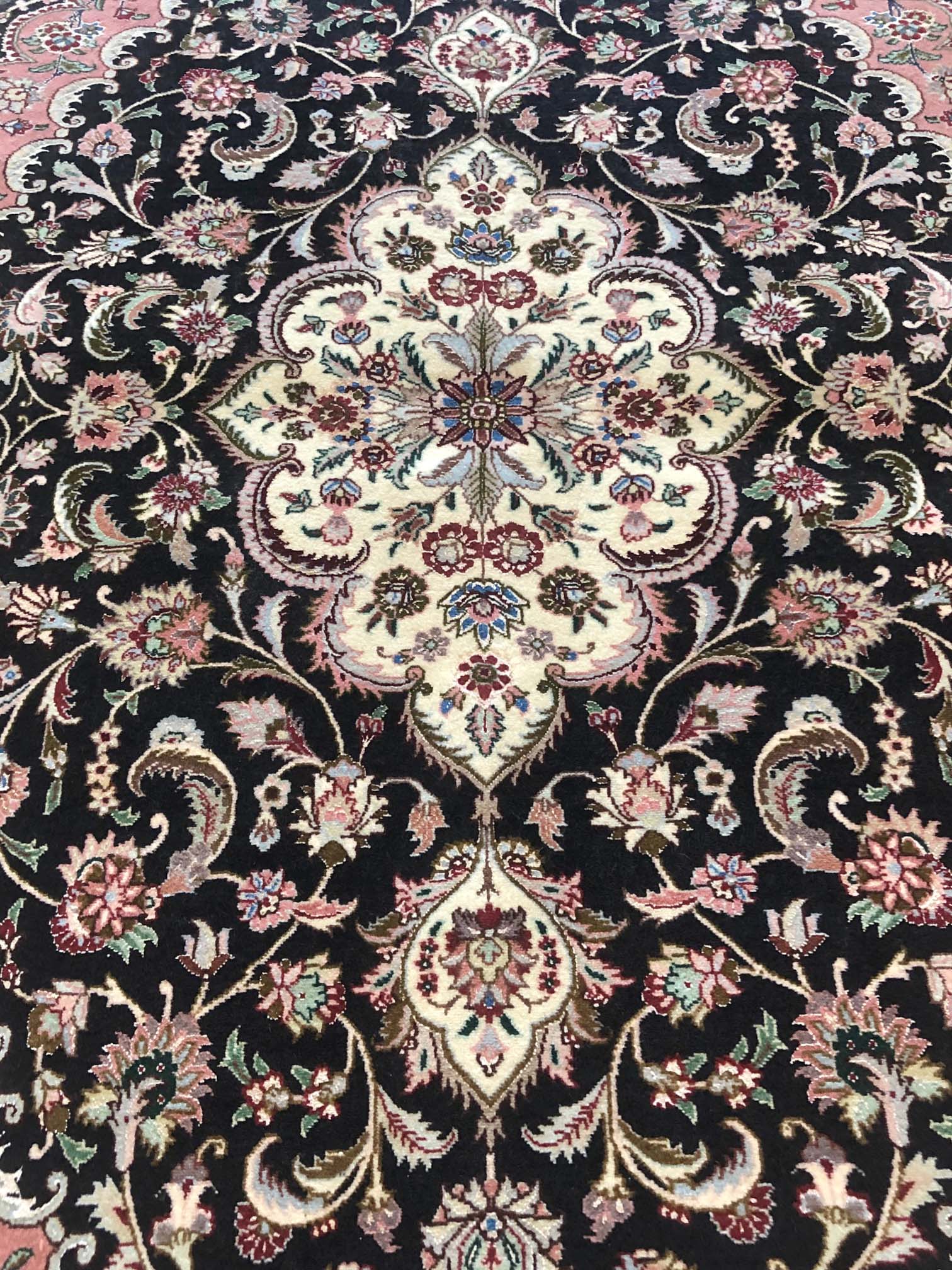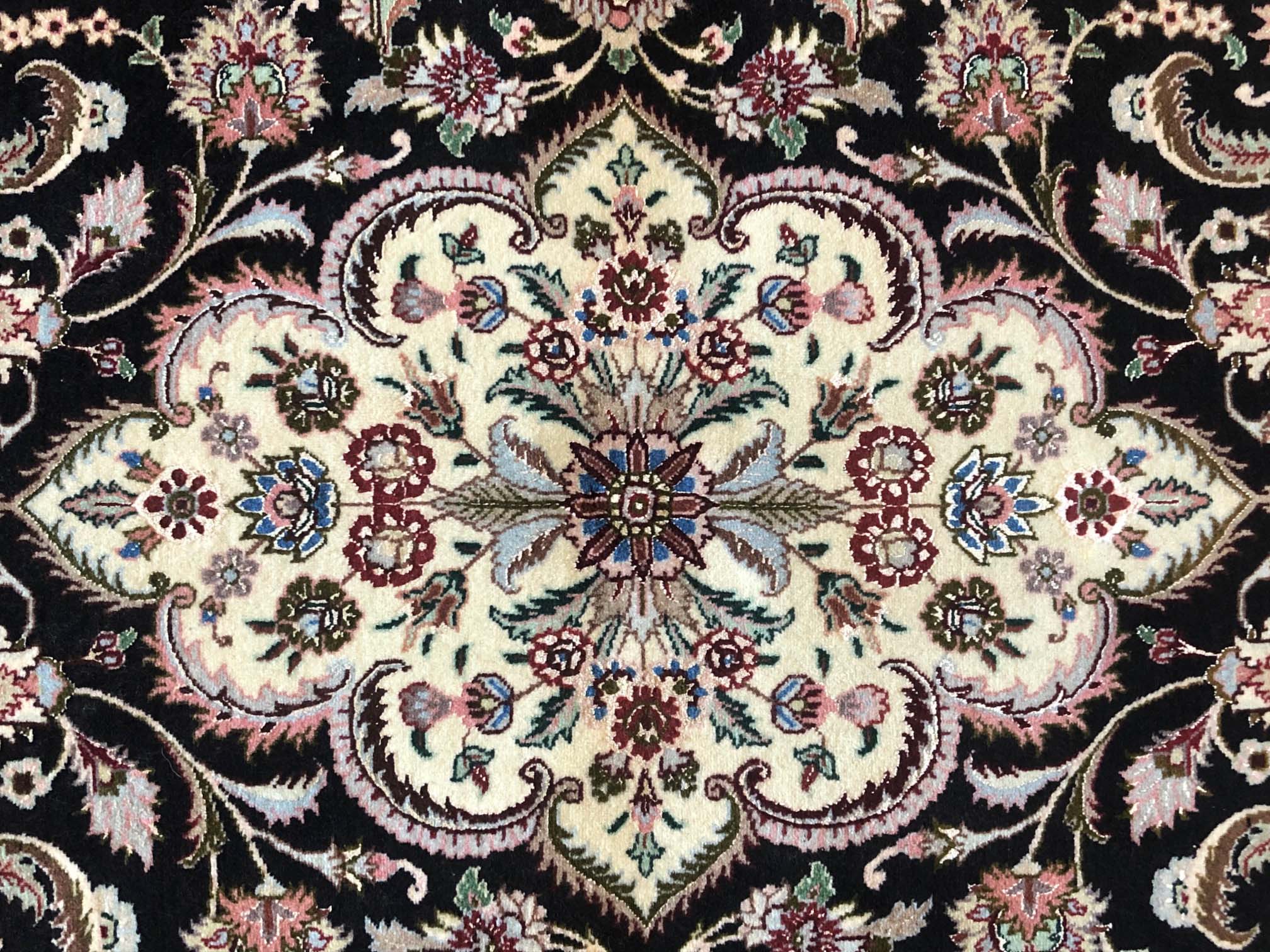 Size: 3.5x5.3 / Pile: Wool & Silk / Foundation: Cotton / Design: Medallion Floral/ Base Color: Black / Border Color: Mauve