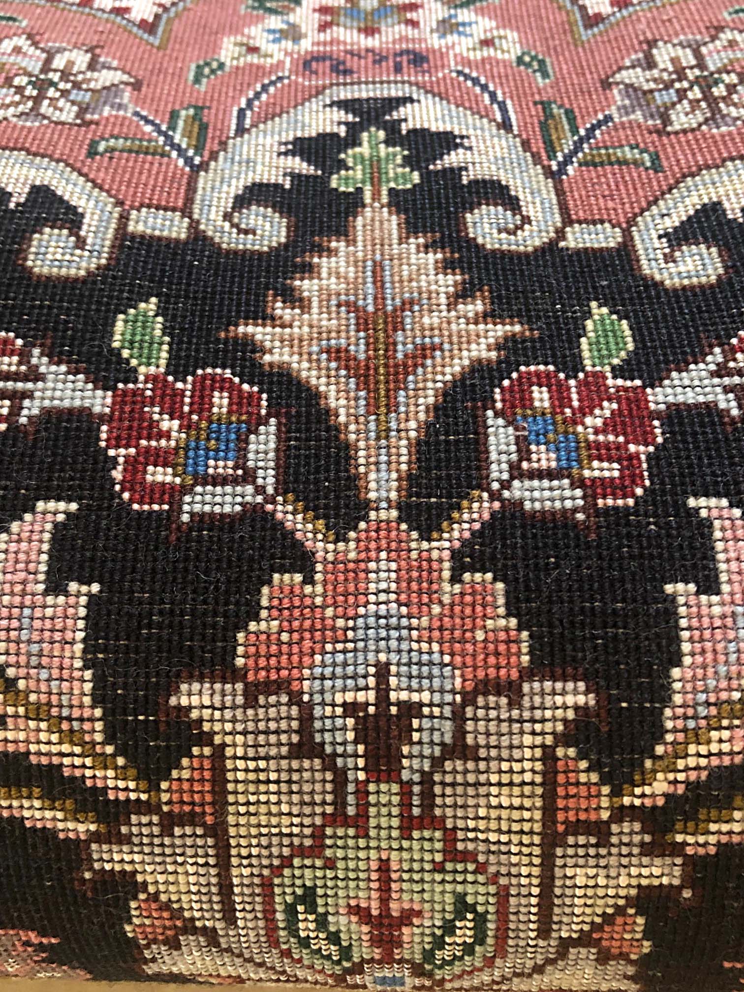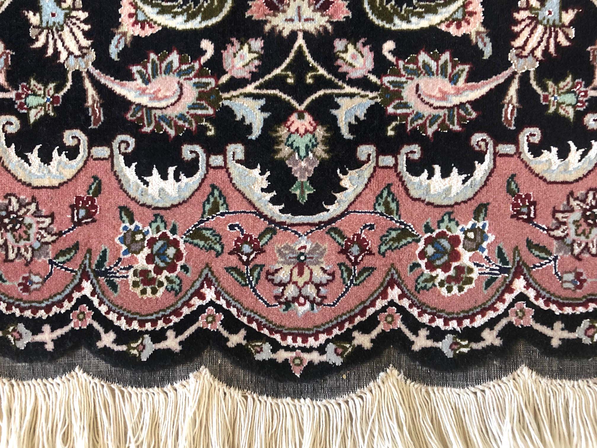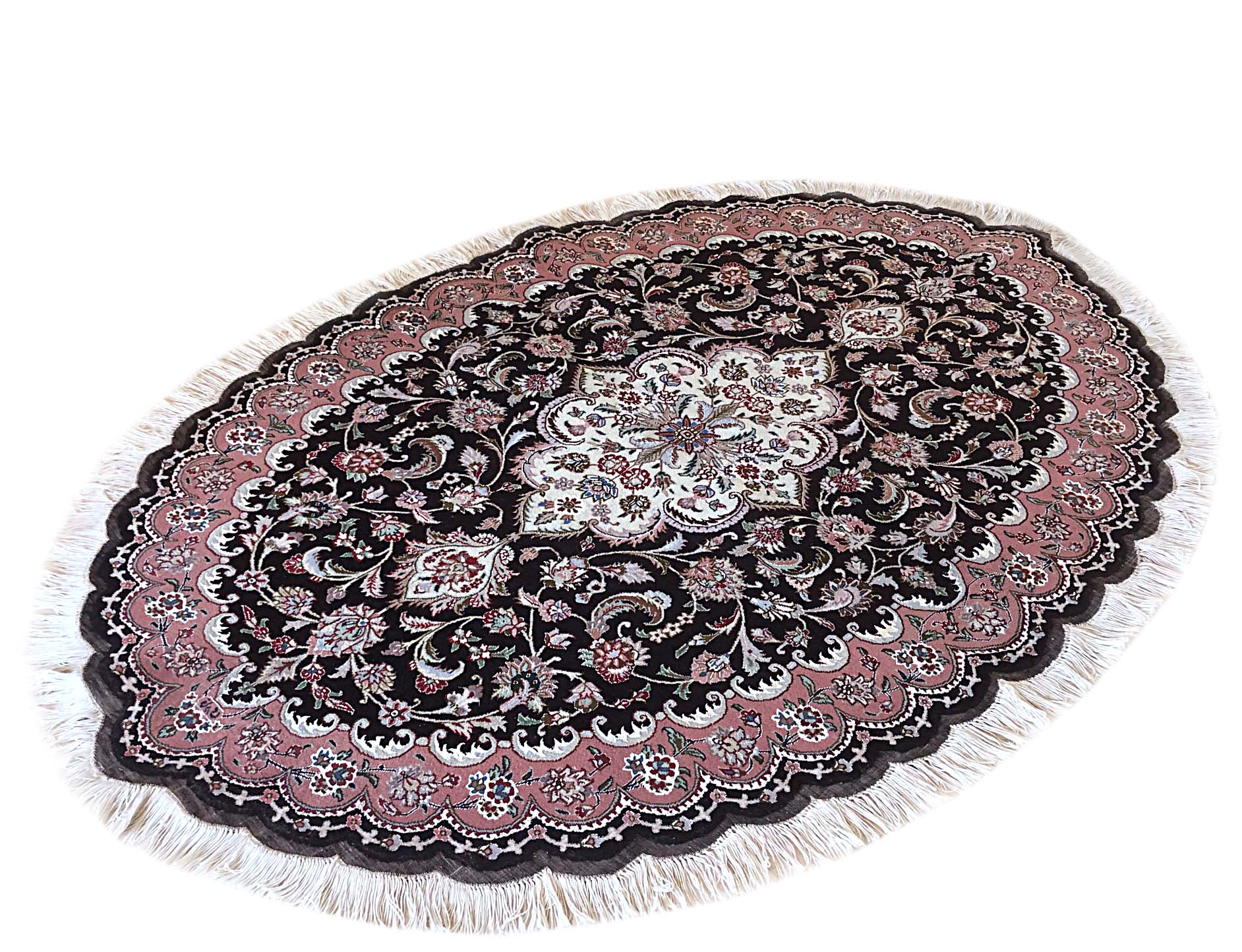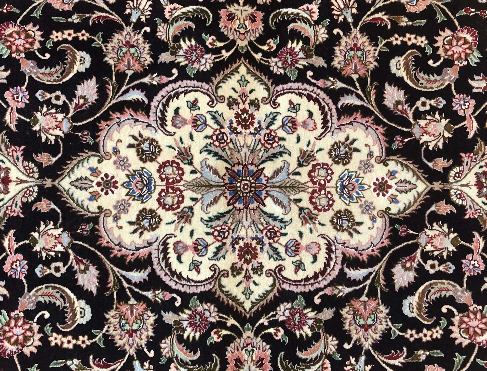 Size: 3.5x5.3 / Pile: Wool & Silk / Foundation: Cotton / Design: Medallion Floral/ Base Color: Black / Border Color: Mauve